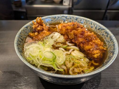 丸政はJR中央本線小淵沢駅構内の立ち食いそば屋で、「山賊そば」と「海賊そば」が看板メニューの店です。大き目の鶏モモ肉の唐揚げをのせた山賊そばは何度でも通いたくなるようなクセになる味わいでした。